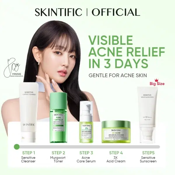 1.SENSITIVE CLEANSER 120ML 2.ANTI ACNE SERUM 20ML 3.3X ACID CREAM 90G 4.MURGWORT ACNE TONER 80ML 5.SENSITIVE SUNSCREEN 30G